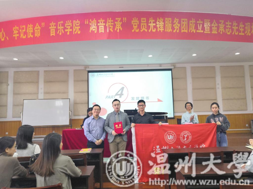 荣幸请到温籍青年指挥家、作曲家金承志来担任艺术指导这一职位。各位领导共同为金承志、叶文辉老师颁发聘书。第五部分内容:校领导潘玉驹的讲话,潘老师首先对时时彩