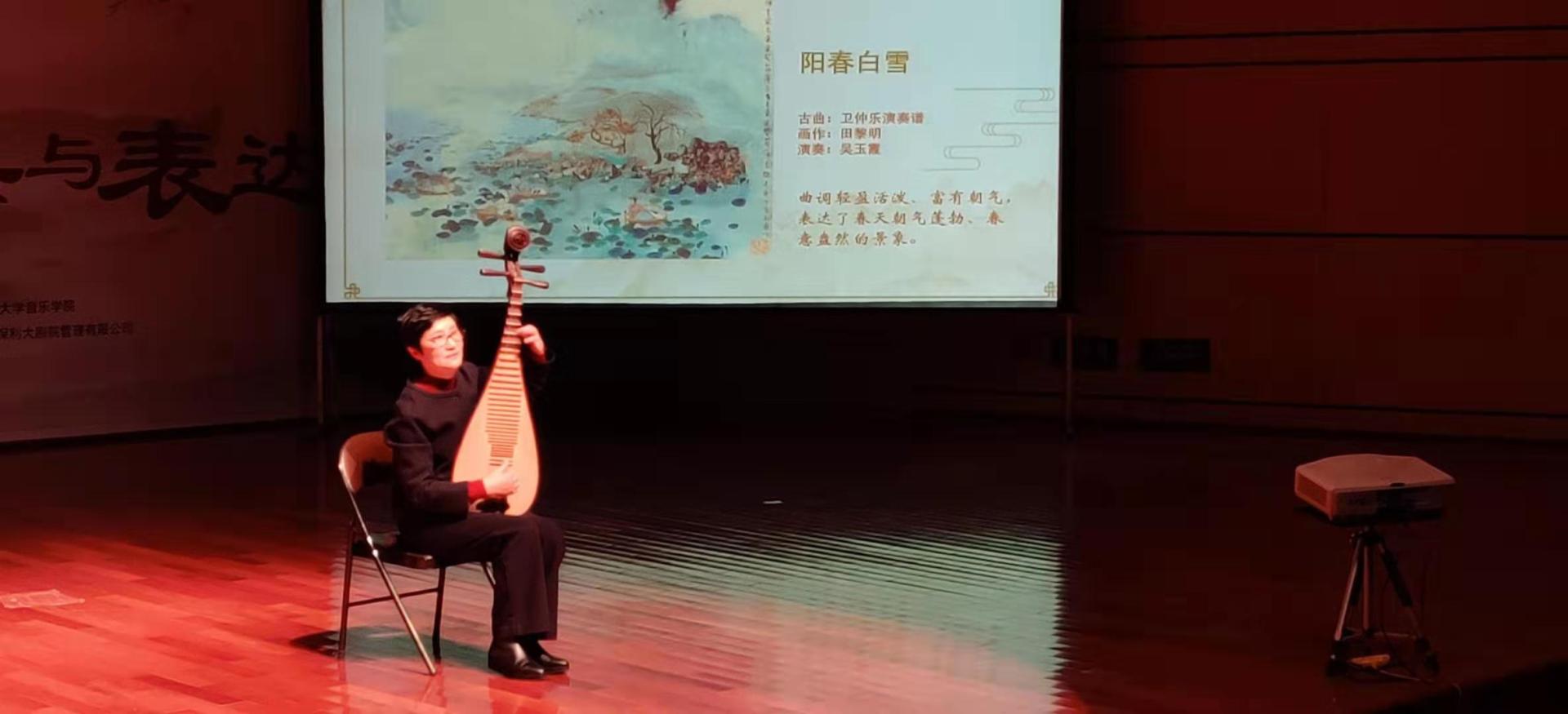 本次讲演,吴老师首先分享了自己学琴与教学的经历,强调了勤奋与坚持的重要性。接着,吴老师分享了关于琵琶这门乐器的自身体会,并对各类民族乐器进行了专业细致的介绍。讲演过程中,吴老师弹奏了琵琶名曲《阳春白雪》、《思春》、《龙船》和《茉莉花》,使同学们能够更直观的感受琵琶曲的优美动听,近乎完美的弹奏也展现了吴老师高超的技艺。然后吴老师介绍了舞台实践的知识,将数十年的舞台经验悉数分享给同学们。最后,本次讲演以吴老师弹奏琵琶名曲《彝族舞曲》和《十面埋伏》作为结束,更使现场观众回味无穷。