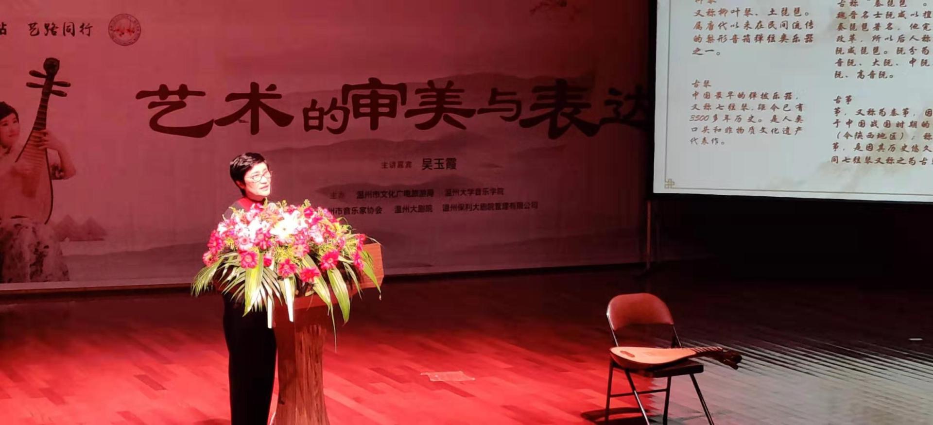 艺术周活动已开展了五天,本周的最后一项活动【讲演赏析会】于温州大剧院举行。讲演的主题为艺术的审美与表现,主讲老师为吴玉霞老师,吴玉霞老师是中国当代著名琵琶演奏家、硕士生导师,中国音乐家协会理事、全国政协委员,中央民族乐团副团长、首席琵琶演奏家,国家一级演员。身兼数职的同时也获得了众多荣誉。