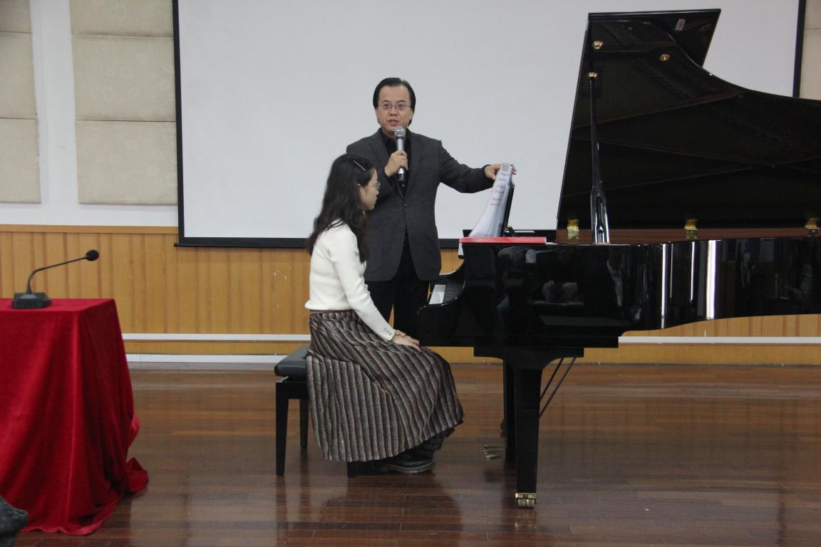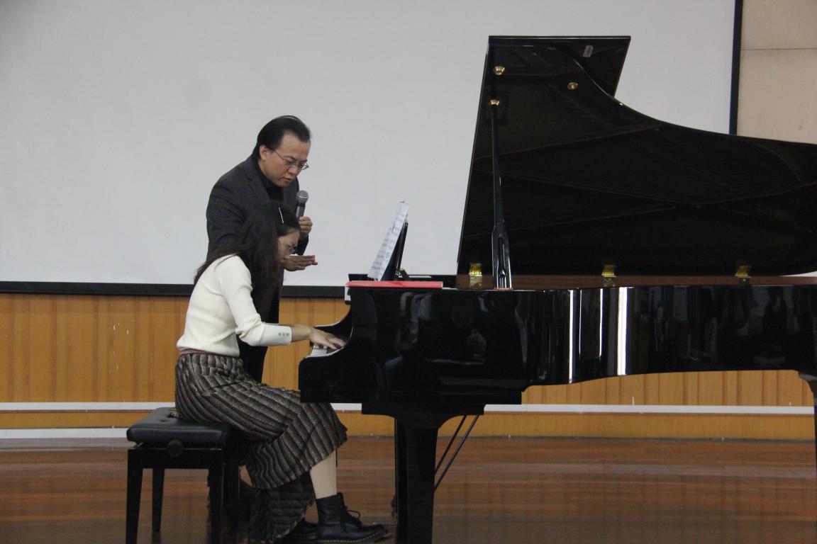 学生徐梦婷弹奏的张帅《三首前奏曲》和袁新凯弹奏的《革命练习曲》。在学生弹奏出现问题时,唐教授会悉心指导,方式生动有趣,也会身体力行亲自示范。不由让我们在尊敬唐教授的同时又觉得亲切。