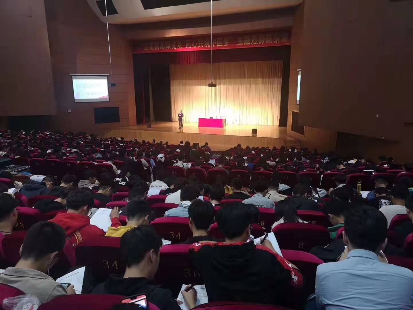 本次课程中,全场座无虚席,每一位同学都在认真倾听并且将重点以笔记的形式写在笔记本上。首先,课程从中国的发展讲起,建国初期的一系列政策一直延伸的今天中国的第二大经济大国,讲师为我们大家介绍了中国是如何一步步发展并崛起的。例如,中国的第一颗原子弹、第一颗人造卫星、改革开放、第一条高铁等等。除了祖国自身的发展,讲师也为我们介绍了习近平总书记的经历以及党和国家的一系列政策方针。当然,也分析了当下我国面临的挑战,例如像中美贸易战这样的当下时政。在讲座中,同学们听得十分投入。