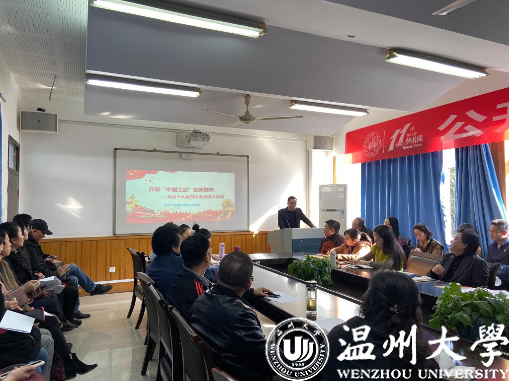 党委于音乐楼203会议室开展党的十九届四中全会精神解读,全体教职工参会,会议由时时彩