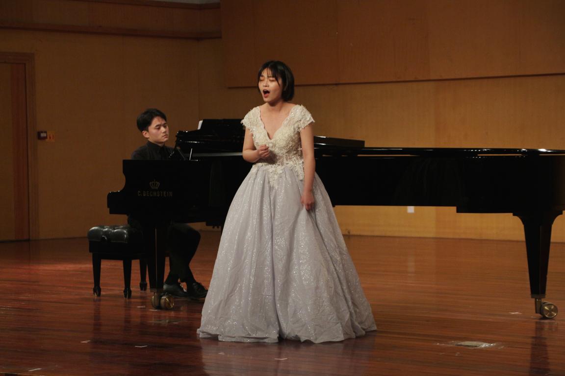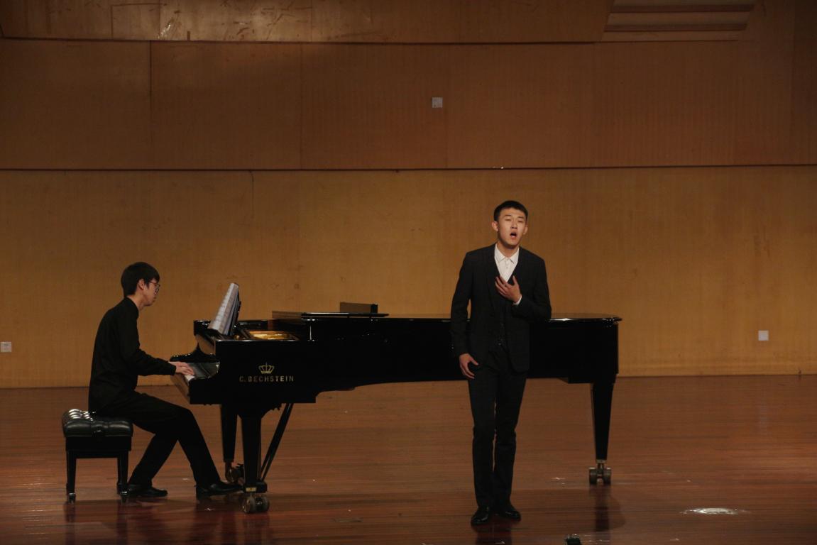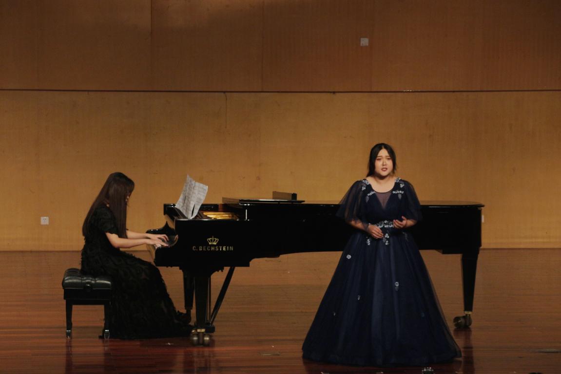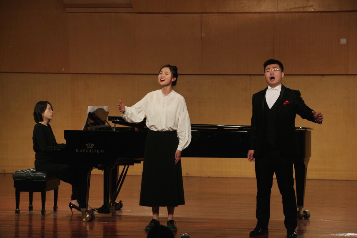 紧接着,是古筝、钢琴重奏《恋春风》,歌曲浪漫唯美,尽显春日朦胧的心动感受,别有一番风味;男高音独唱《歌》,缠绵悱恻、婉转凄凉;男女生二重唱《月光近 月亮远》,更是一首悲冷的“夜曲”,词曲交融在秋冬两季,寄托于黄昏与夜空之中。歌曲情感细腻,大到国破家亡的伤痛;小到蒹葭之思的愁苦。伴奏在莫颖老师的渲染下,更显歌曲情感的凄美。而柳琴独奏《剑器》与前者形成鲜明的对比,将柳琴的金属感发挥的淋漓尽致。既描绘“临颍美 人在白帝,妙舞此曲神扬扬”的柔美,又有“来如雷霆收震怒,罢如江海凝清光”的辉煌。