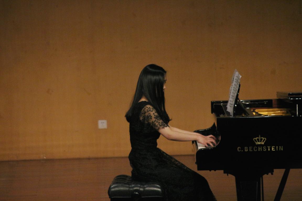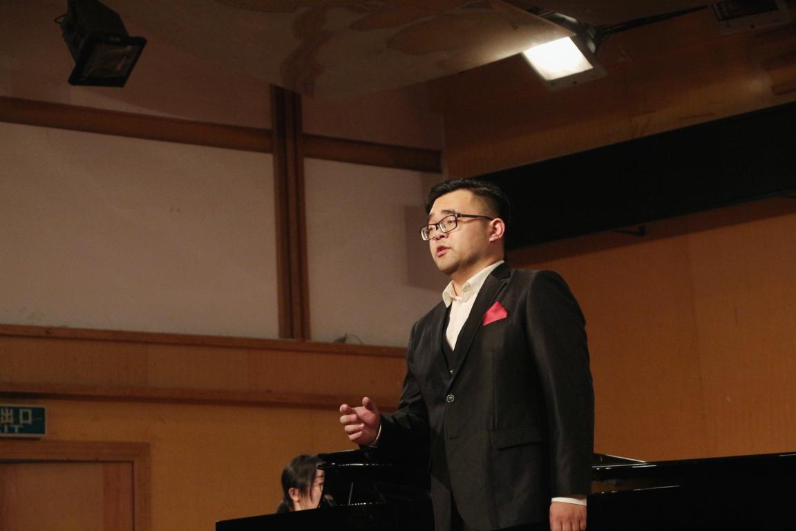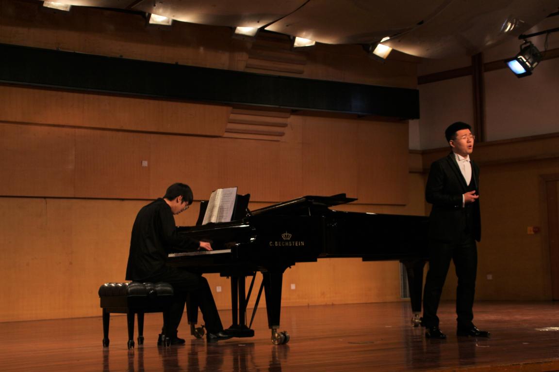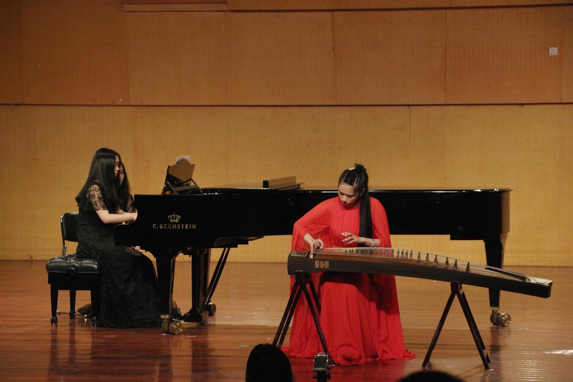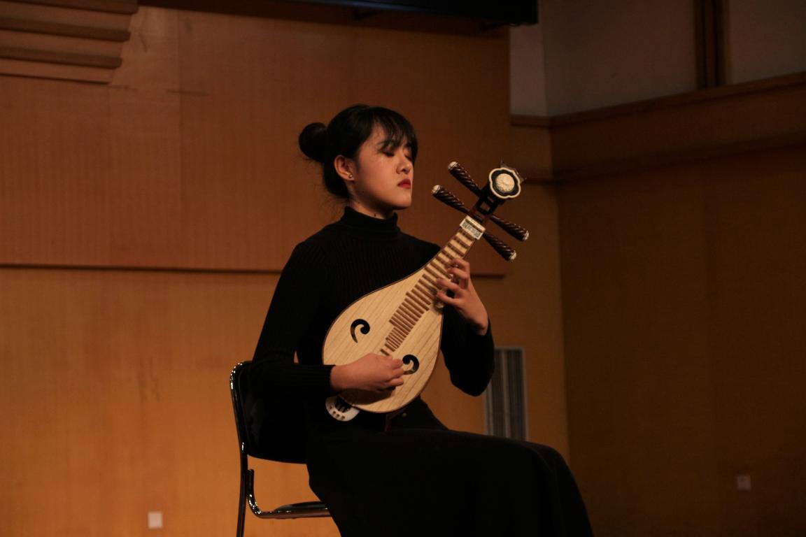 紧接着,是古筝、钢琴重奏《恋春风》,歌曲浪漫唯美,尽显春日朦胧的心动感受,别有一番风味;男高音独唱《歌》,缠绵悱恻、婉转凄凉;男女生二重唱《月光近 月亮远》,更是一首悲冷的“夜曲”,词曲交融在秋冬两季,寄托于黄昏与夜空之中。歌曲情感细腻,大到国破家亡的伤痛;小到蒹葭之思的愁苦。伴奏在莫颖老师的渲染下,更显歌曲情感的凄美。而柳琴独奏《剑器》与前者形成鲜明的对比,将柳琴的金属感发挥的淋漓尽致。既描绘“临颍美 人在白帝,妙舞此曲神扬扬”的柔美,又有“来如雷霆收震怒,罢如江海凝清光”的辉煌。