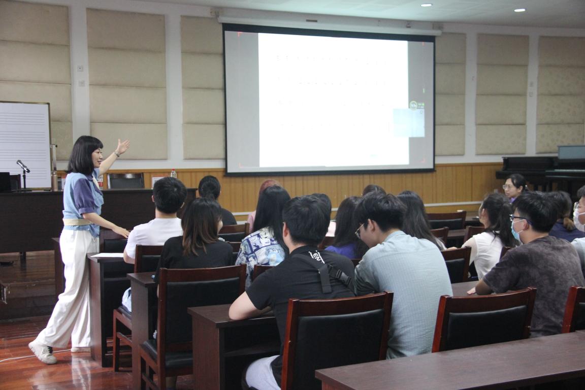 首先,徐李燕老师提到了不同的音乐要素所要达到的一些目标要求是不同的,音乐要素的多样性可以丰富我们的音乐。因此,了解音乐要素在课堂中的重要性,是我们必须要知道的。接着,徐丽燕老师对音乐要素进行分点概括。第一,我们要精抓音符的时值,这里提到了从感性到理性的认知。老师通过不同的歌曲来展现不同的音符时值,这便于小朋友理解什么是音符时值,在他们能更好的理解之后,再提出理论的东西,让时值直观的展现在孩子的眼前。第二,我们要精抓“音符”,从单音到音型再到乐句,让孩子感受旋律的高低以及乐句的走向。为此,徐丽燕老师还邀请我们同学上台一起互动,让大家更加真实的体会到在课堂中的感觉。第三,我们要抓音色,音色实际上是声音当中所传达的最无与伦比的色彩,也正是因为音色的差异使得音乐作品呈现出现不同面貌,抓好孩子们的音色,让他们对声音之美有一定的要求,会让音乐听起来更加的丰富饱满。