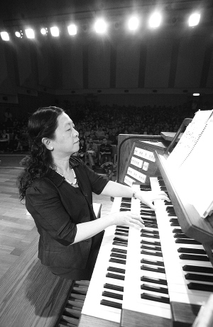 一架巨大的管风琴醒目地安放在音乐厅内,美国加州圣工研究院音乐系管风琴硕士导师、钢琴及管风琴演奏家陈芬芳副教授,手脚并用,为观众演奏出美妙的旋律,高超的演奏水平博得阵阵掌声。