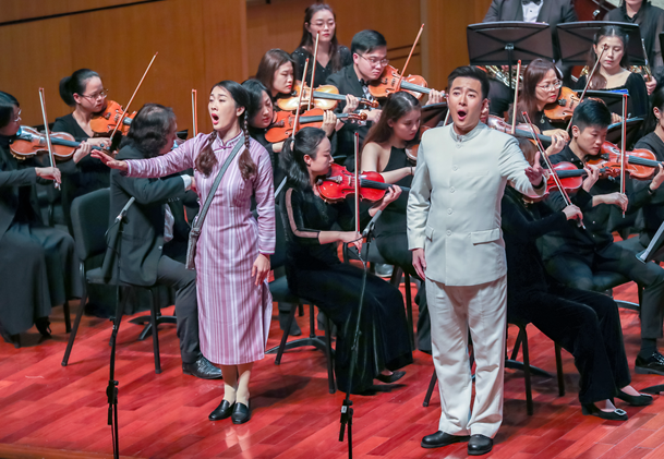 青年艺术剧团合唱团逐一登台献唱,十余首剧中的代表性曲目,在层层递进中展现了如火如荼的抗争和崇高理想的追求,极富故事感的歌声在观众心中绘出了五星红旗的最美图景,令人不由为温州人的杰出与非凡喝彩。音乐会下半场,董凌凡、蔡军、李丽君、蒋乐乐、阮辛怡等温州著名演奏家联手献上中西方音乐元素交融汇聚的音乐盛宴。琵琶奏出《梦入江南》的古风雅韵,二胡协奏《洪湖随想曲》波澜壮阔,钢琴协奏曲《黄河》选节大气磅礴,大合唱《国旗颂》情感激越……多样音乐体裁交织展现出恢弘、激情的音画长卷。最终,音乐会在《拉德斯基进行曲》欢快劲昂的旋律中画上圆满句点。
