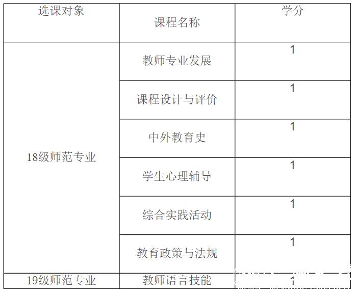 师范类专业本科人才培养方案,要求18级学生对教师教育类公共选修课必须修满6学分,19级学生对教师教育类公共选修课必须修满3学分。根据培养方案课程设置,2020-2021-1学期开设的教师教育类公共选修课如下附表: