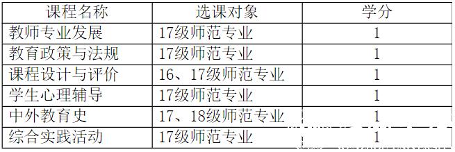 师范类专业本科人才培养方案,从15级开始全面放开选课,要求学生对教师教育类公共选修课必须修满6学分。根据培养方案课程设置,2019-2020-1学期开设的教师教育类公共选修课如下附表: