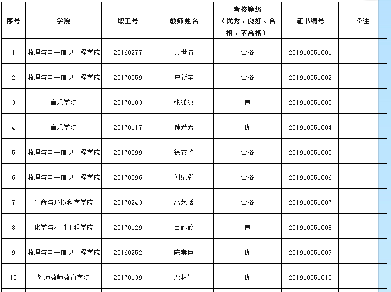 根据《时时彩 青年教师助讲培养实施办法(试行)》(温大行政〔2013〕115号),时时彩 于近期组织开展了2019年1月份青年教师助讲培养考核工作,数理与电子信息工程时时彩 黄世沛等16位教师通过考核,现将具体考核结果公布如下: