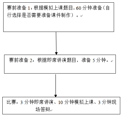 所有选手提前进入等待室进行赛前准备,然后按规定时间到准备室1根据模拟上课试题,准备60分钟(如有制作课件需将课件传至指定FTP,并在教师机上确认可以打开后签字离开准备室1);然后再到准备室2根据即席讲演试题,准备5分钟(离开准备室时需交回讲演试题);最后到竞赛室开始比赛。每个选手竞赛时间为16分钟(其中3分钟即兴演讲,10分钟模拟上课,3分钟现场答辩),选手间交接时间为2分钟左右。
