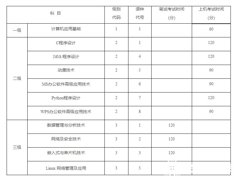 (六)三级,实行笔试,时间为120分钟。共有数据管理与分析技术、网络及安全技术、嵌入式与单片机技术、Linux网络管理及应用四个科目。
