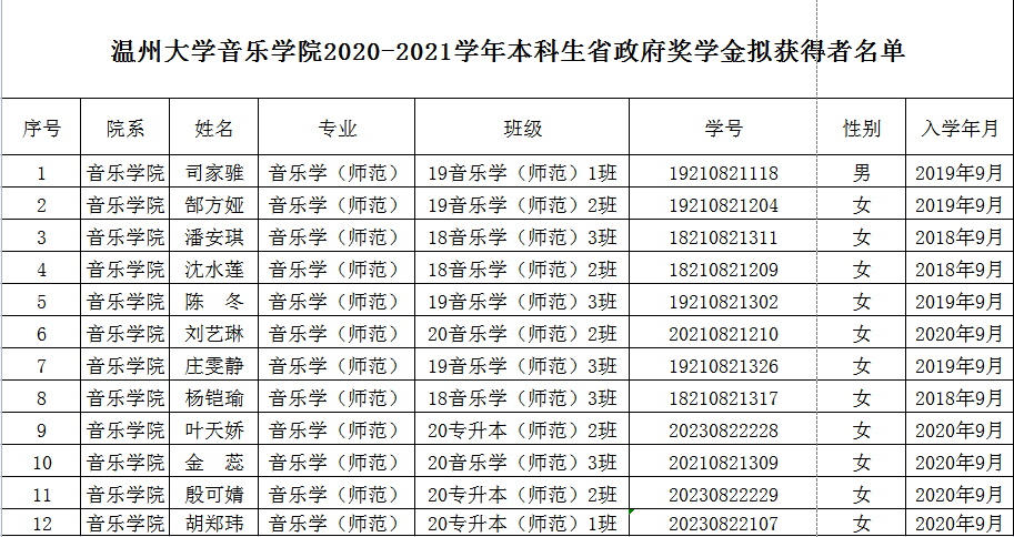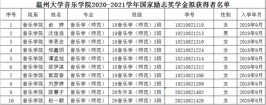 2020-2021学年省政府奖学金拟获得者,俞婷等10位同学作为国家励志奖学金拟获得者,现将初审名单予以公示。