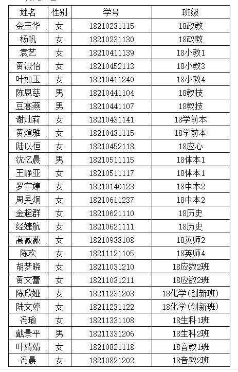 教师教育溯初班管理办法(2019年修订)》(温大行政〔2019〕189号),从即日起吸收金玉华等26位同学成为第十二期溯初班的正式学员(名单见下表)。希望她们继续努力学习,完成溯初班的学习任务。