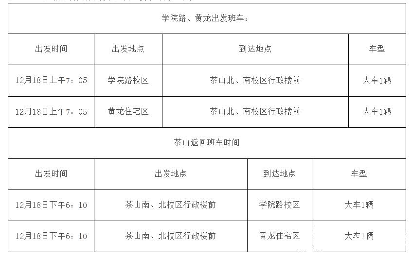 5、考试期间将增开校车班次,发车时间如下表: