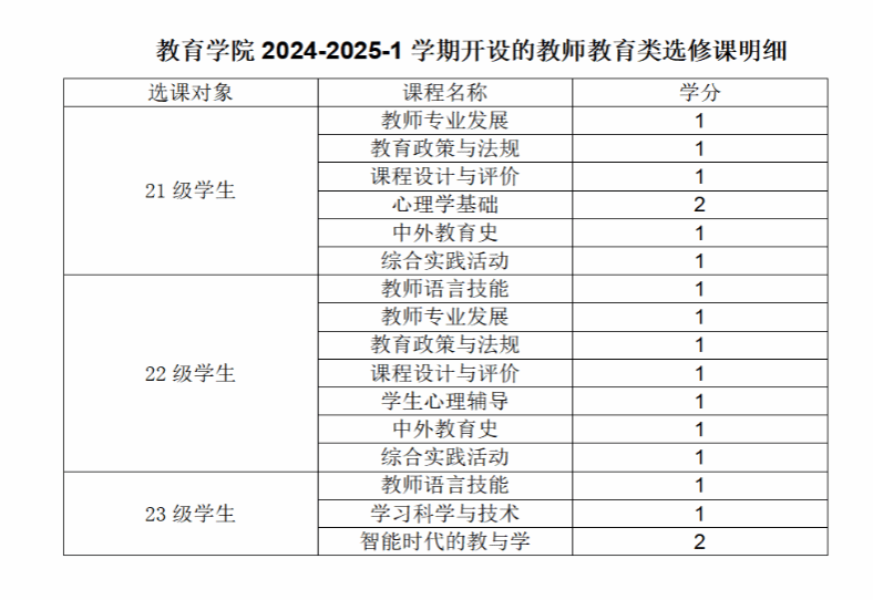 一、选课课程及选课对象:见附件《2024-2025-1教师教育类任选课--教学任务.xls》;