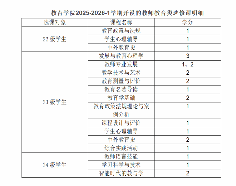 一、选课课程及选课对象:见附件《2025-2026-1教师教育类任选课--教学计划.xls》;