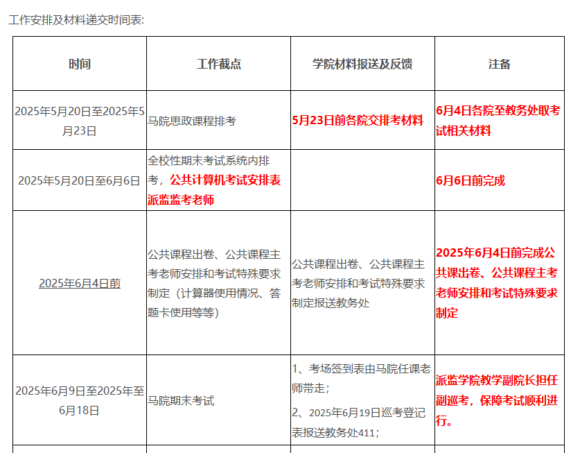 2.2025年5月20日至6月4日前,在正方系统中完成全校期末集中考试巡考及监考老师安排(正方系统路径:考试管理——考试方式设定——生成考试试卷号;考试管理——集中考试排考——考试时间安排;考试管理——集中考试排考——考试时间安排——刷新考试数据),另对公共计算机考试安排表派监监考老师。