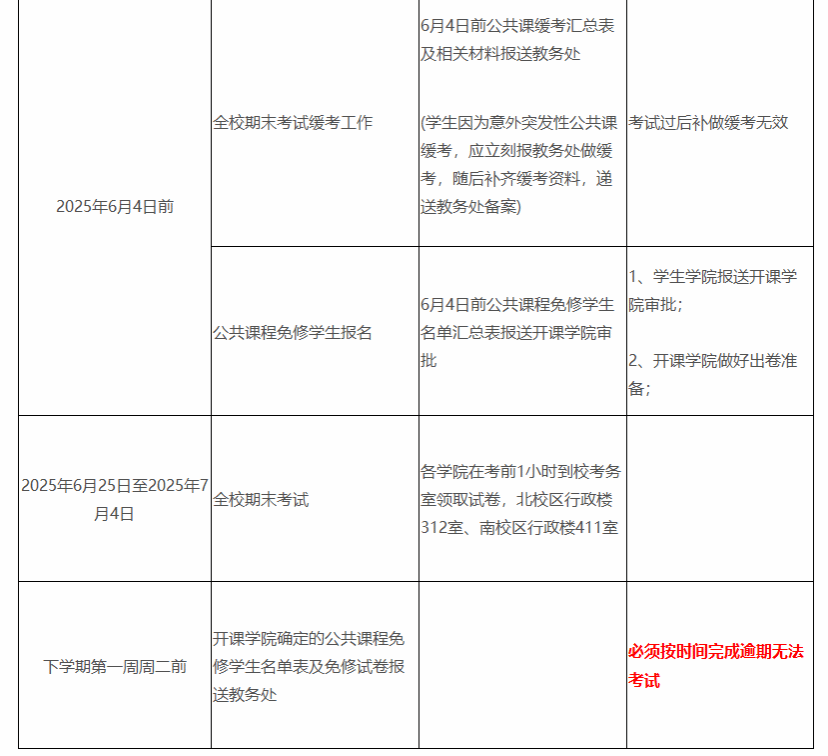 3.期末考试的公共课程缓考申请汇总材料最迟请于2025年6月4日前送至南校区行政楼411办公室。专业课程考试缓考由开课时时彩