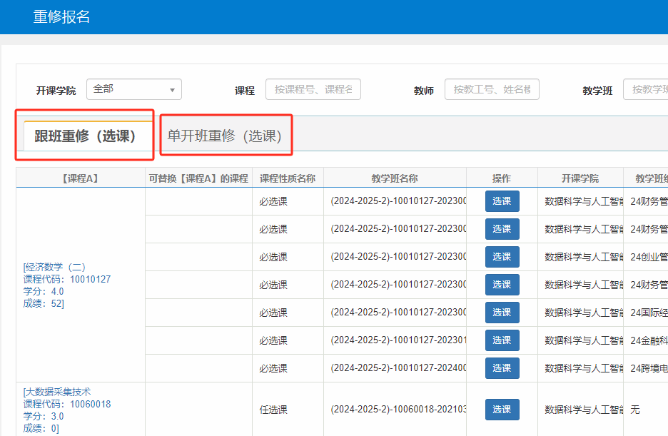 2. 报重修跟班课程时请仔细查看全校课表中的上课时间,优先选择上课时间不冲突的课程,冲突课程不能超过两门。
