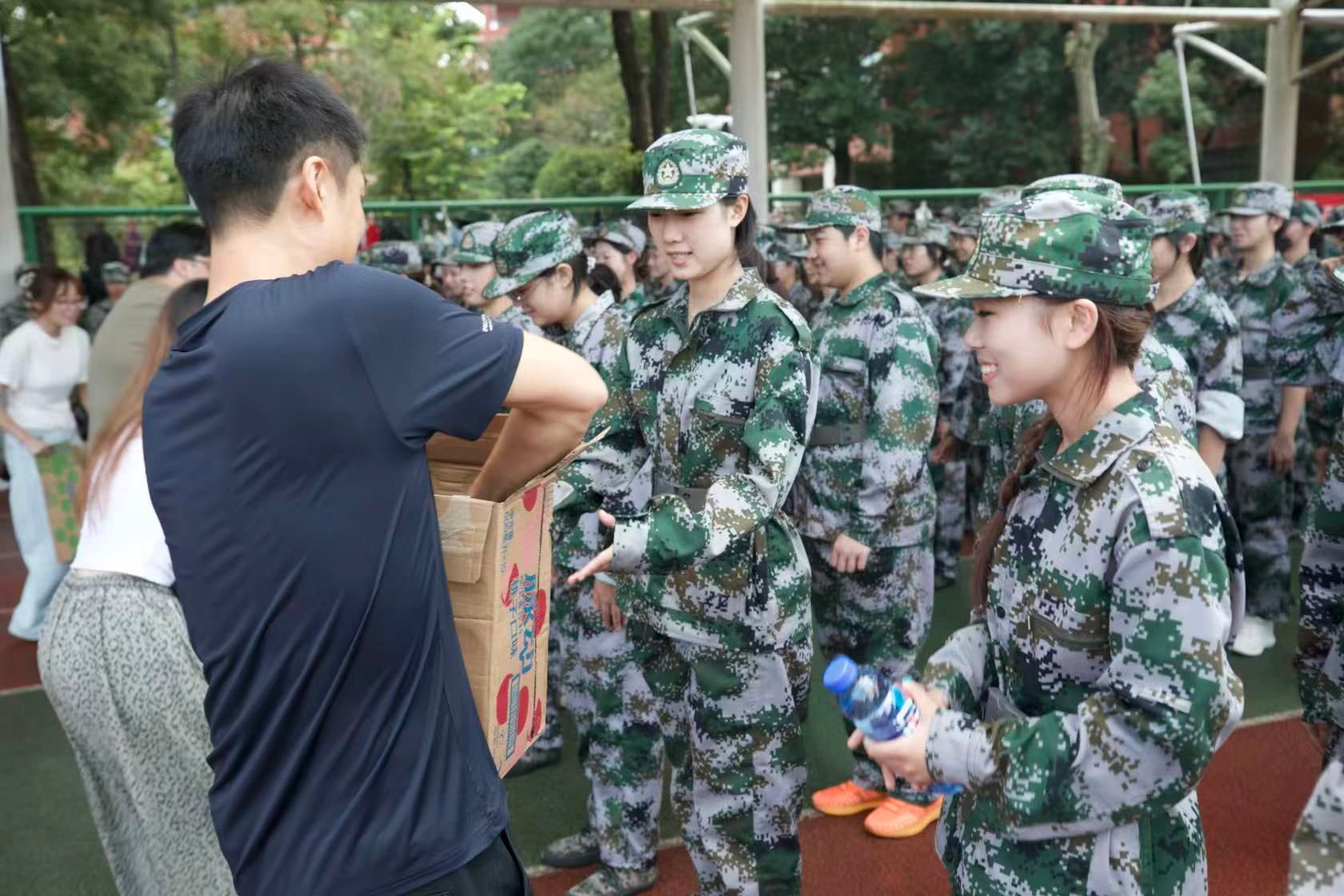 深切关爱的军训慰问品一一送到同学们手中,时时彩